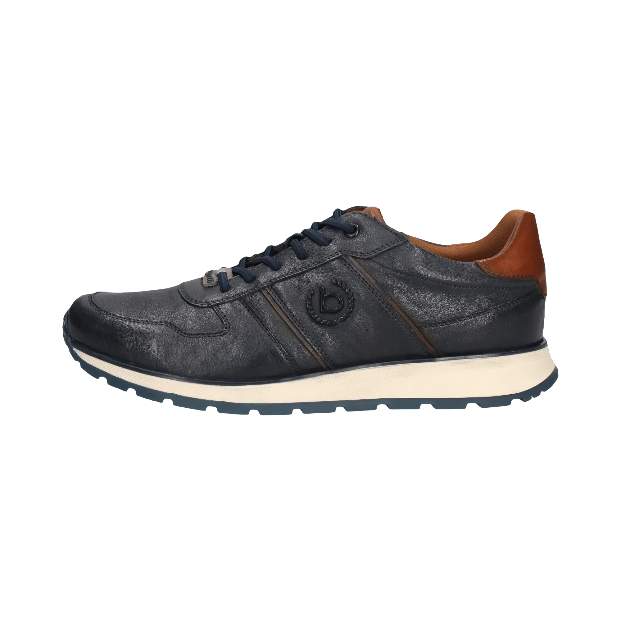 Bugatti férfi bőr sportcipő. Sötétkék színben, barna díszítéssel és logóval, modern esztétikát tükrözve. Ideális alternatívája az úriember laza eleganciájának, a klasszikus kifinomultságot modern stílussal ötvözi. Páratlan kényelmet kínál a memóriahabos kialakításnak köszönhetően, így minden alkalommal, amikor felveszed, a lábad is kényelmesen érzi majd magát!